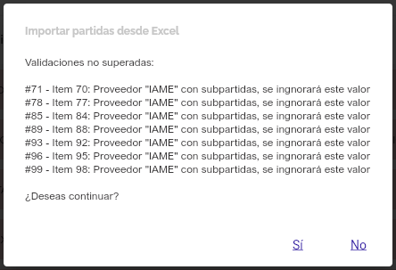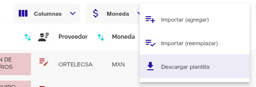 Este proceso permitirá agregar o reemplazar partidas dentro de la versión de una cotización, siempre y cuando se superen validaciones requeridas para su correcto registro. Si escoge la opción “Importar (agregar)”, las partidas importadas se anexarán a las existentes. Si selecciona la opción “Importar (reemplazar)”, se eliminarán todas la partidas registradas previamente y serán reemplazadas por las que se hayan incluído en la plantilla.