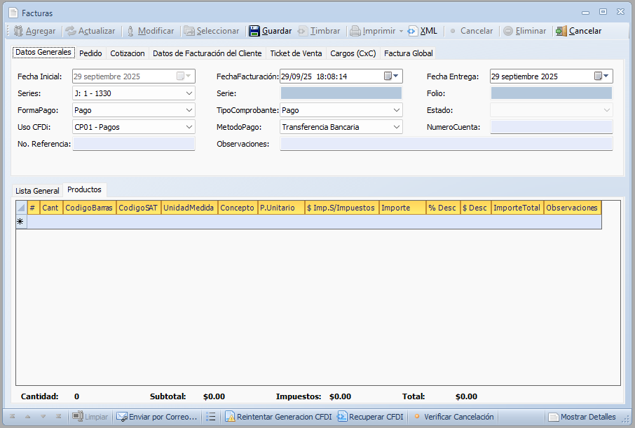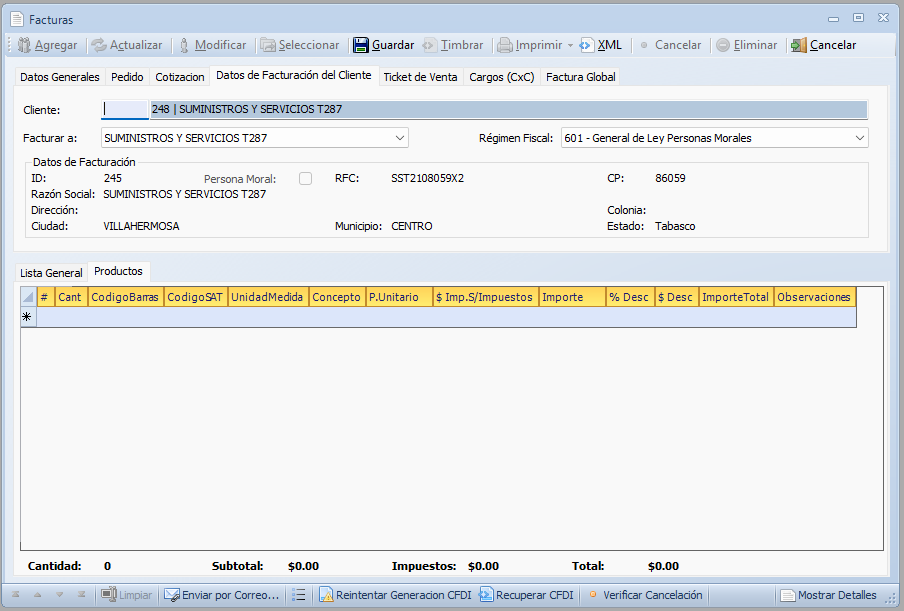 - En la pantalla de facturación haga clic en la opción Agregar.