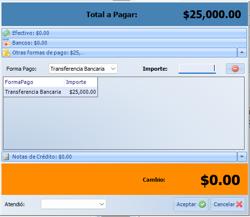 - En la ventana de cobro, especifique nuevamente la forma de pago deseada, este segundo paso es para efectos del corte de caja. Haga clic en Aceptar.